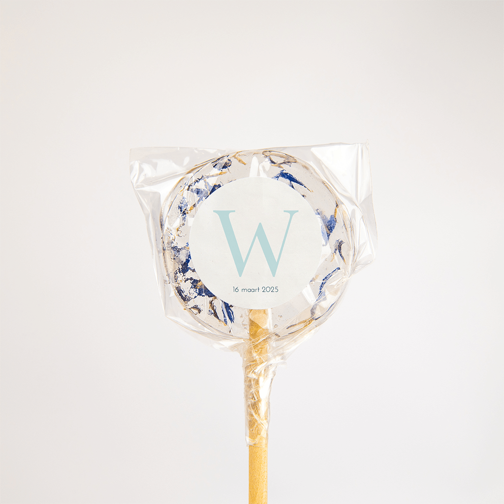 Sticker met groot initiaal van jullie kleintje in het midden in lichtblauwe kleur.