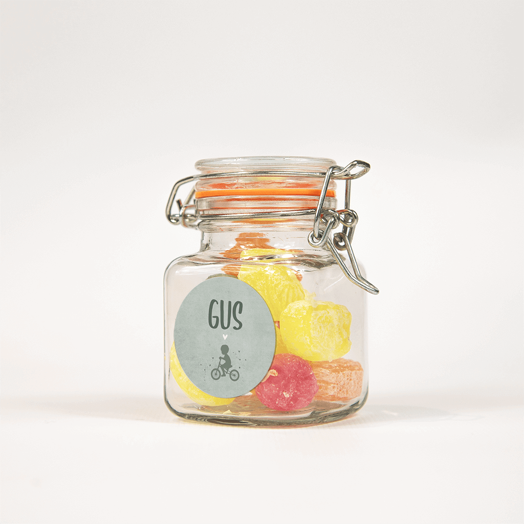 Grappige grijsgroene sticker die bij het geboortekaartje van jullie zoontje past. De naam staat in trendy typografie en komt door het donkergroen mooi naar voren. Onder de naam het silhouet van een jongen op een fietsje, de hartjes er omheen maken het helemaal af!