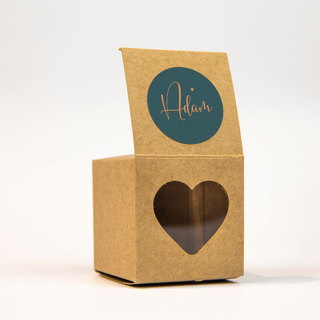 Deze sticker past goed bij het geboortekaartje met goudfolie. Op de donkergroene achtergrond staat de naam van jullie zoontje in trendy letters centraal, het kleine hartje is de finishing touch!
