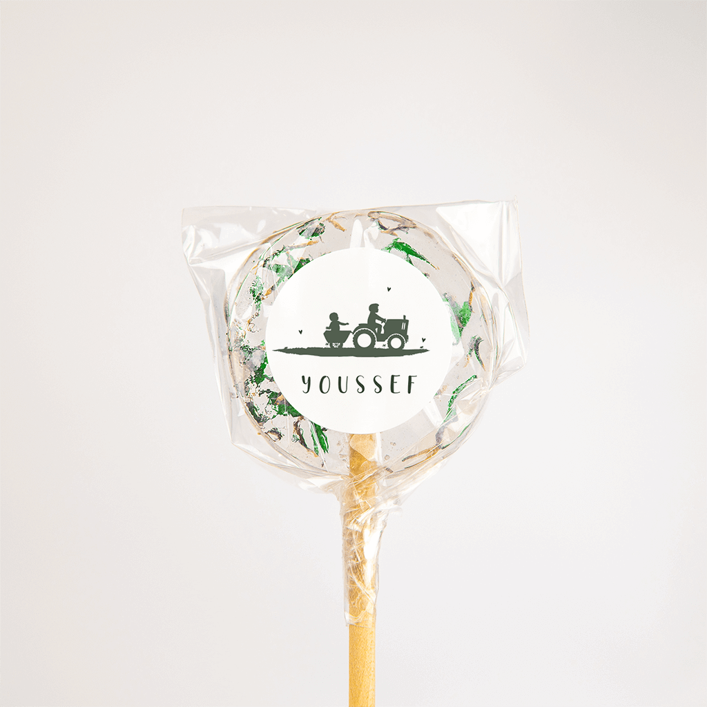 Deze sticker is passend bij het houten geboortekaartje met het boerderij tafereel. Boven het silhouet van een trekker met aanhanger kleine hartjes, eronder de naam in hip lettertype, helemaal trendy!