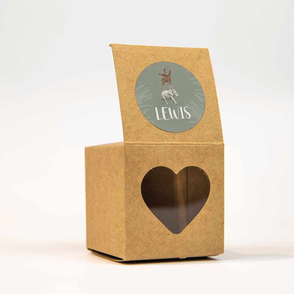 Superstoere sticker bij het geboortekaartje van jullie zoontje! Op de olijfgroene achtergrond met grassen komt de naam in trendy witte letters mooi naar voren. Erboven gestapeld zijn een olifant, giraffe, welpje en een aapje, echt cool!| Totaalprijs: 0 |