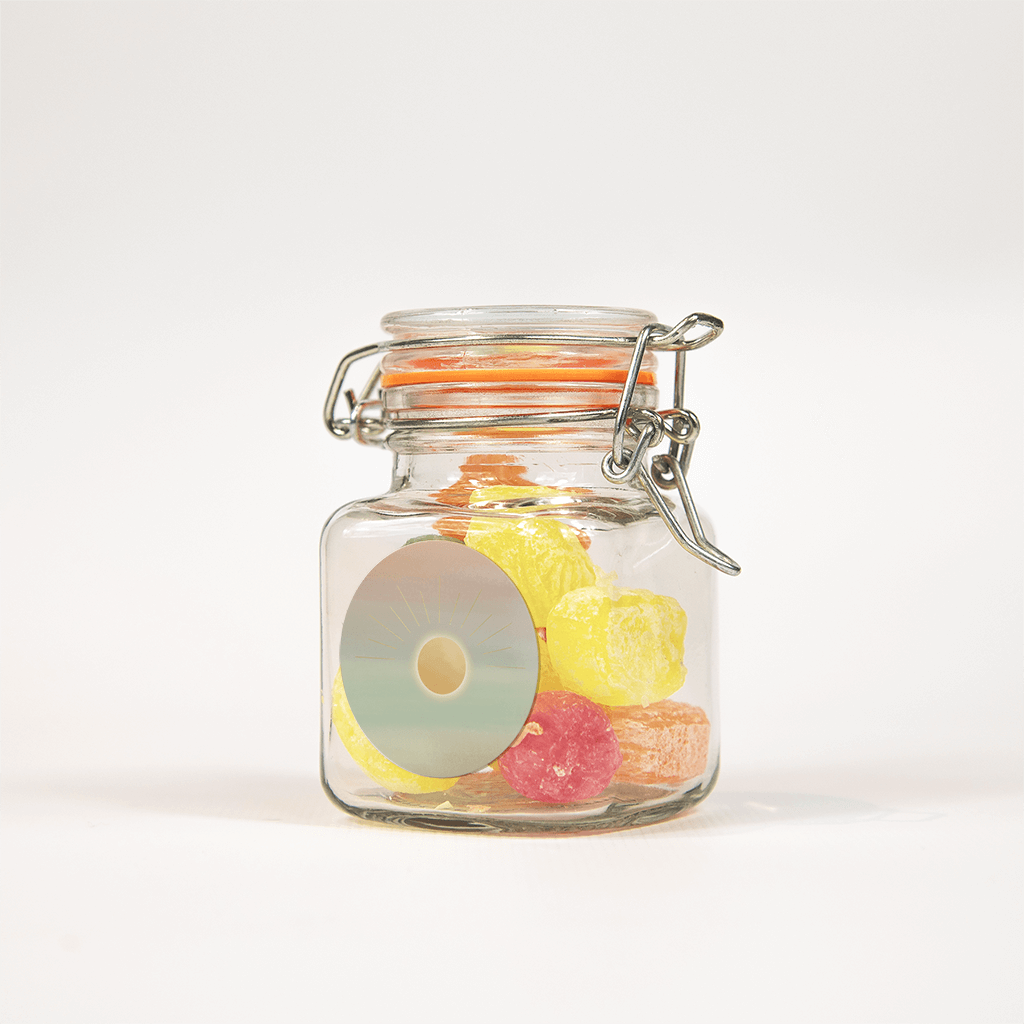 Elegante sticker met een watercolor achtergrond van verschillende kleuren en een stralende zon in het midden. Combineer deze sticker met de bijhorende geboortekaart.
