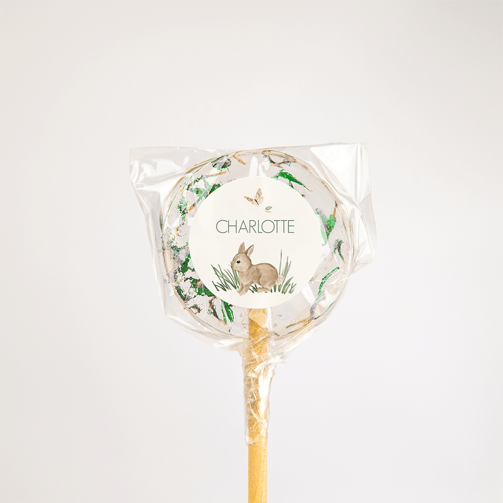 Romantische sticker die bij het geboortekaartje van jullie kindje past. Op een pastelkleurige achtergrond komt de naam duidelijk naar voren. Eronder zit een klein konijntje in het gras en boven de naam fladdert een vlindertje, superlief!