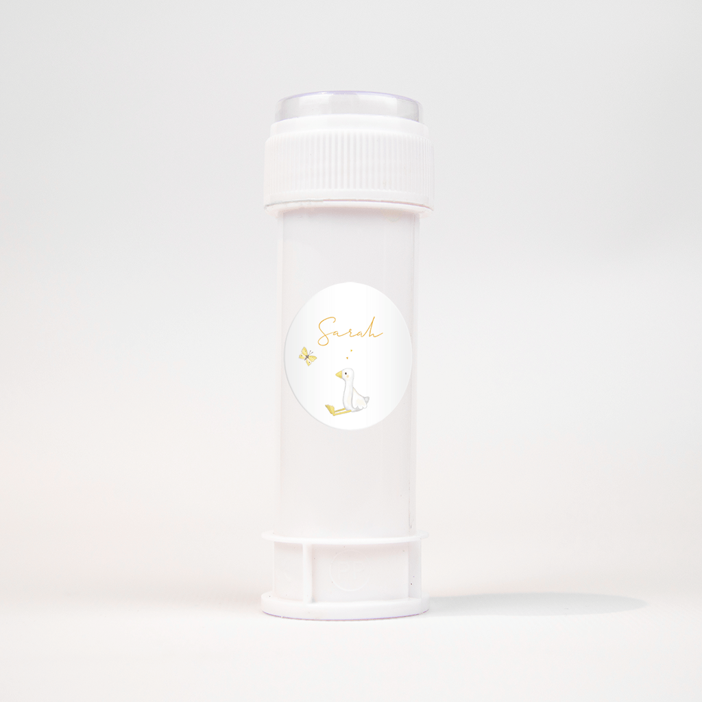 Helemaal in de stijl van het geboortekaartje, dit romantisch tafereeltje van een grappig gansje en een vlindertje erboven. De naam staat in een speelse letter en valt mooi op als je de sticker op de envelopjes plakt.