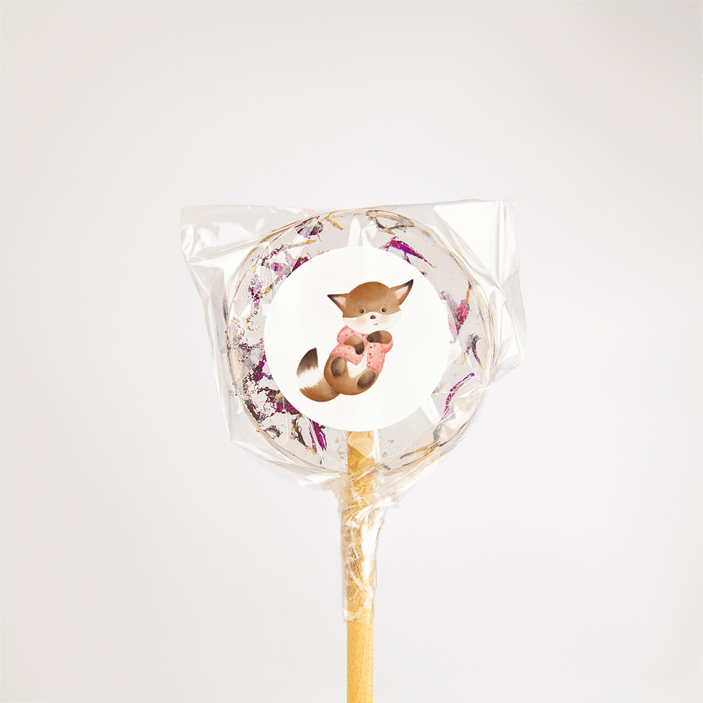 Op deze sticker ligt een lief vosje met een schattig roze vestje op haar ruggetje. Hetzelde vosje staat ook op het bijhorende geboortekaartje.