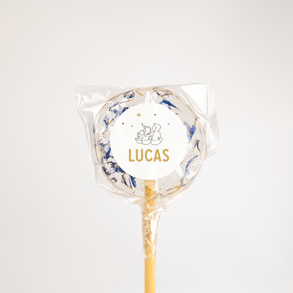 Op deze bijpassende sticker bij het geboortekaartje van jullie zoontje staat de naam in moderne letters in geel. Erboven een leuke lijntekening van drie kinderen die naar de sterren kijken. Maak er een mooi geheel van door met deze sticker de envelopjes te sluiten!| Totaalprijs: 0 |