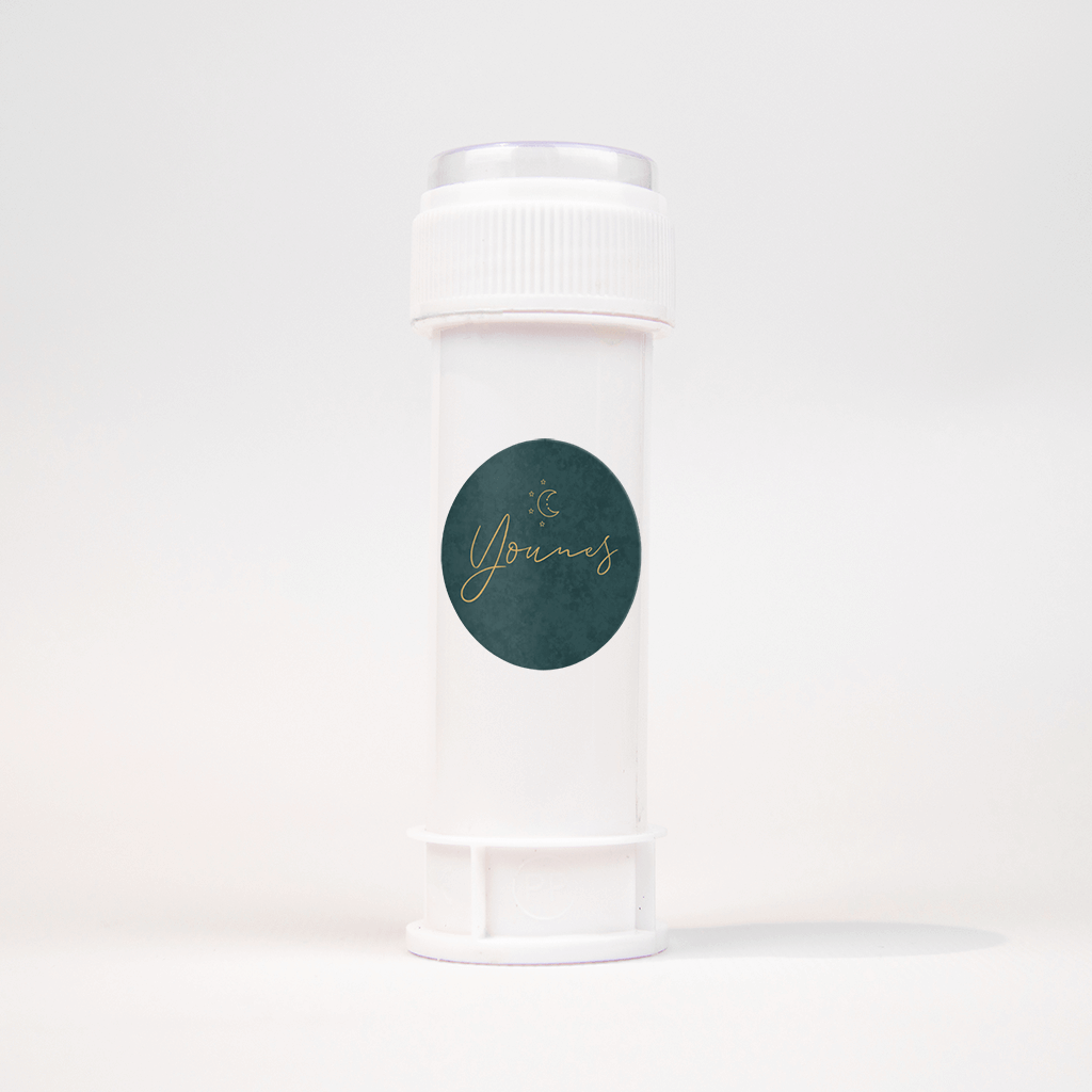 Naamsticker in donkergroene velvetlook met maan en sterretjes in goudlook.