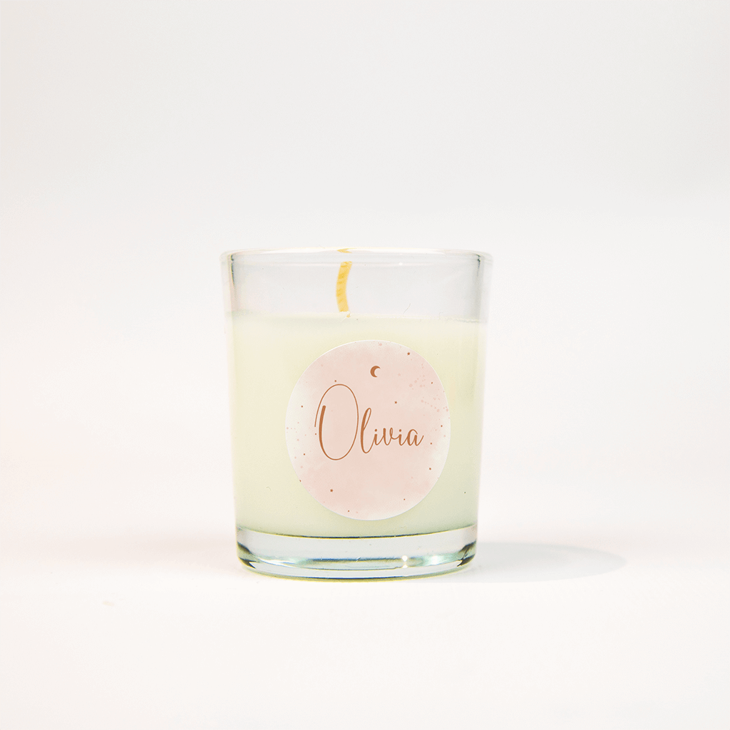 Bijpassende sticker bij het geboortekaartje van jullie dochter. Op de roze aquarel achtergrond staat de naam in een sierlijk lettertype centraal. Erboven een maantje en verspreid over de sticker kleine sterretjes.