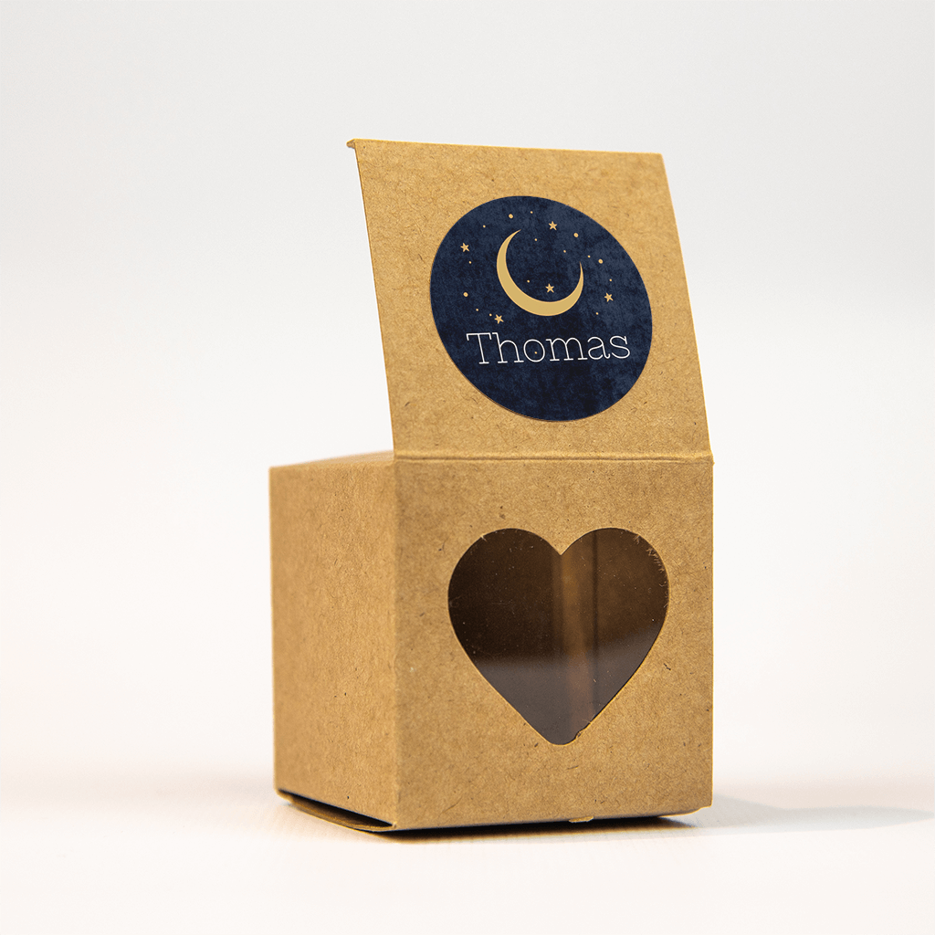 Deze sticker past perfect bij het geboortekaartje van jullie zoontje. Onder de goudgele maan en sterren op de donkerblauwe velvetlook achtergrond staat de naam van de kleine in strakke witte letters.