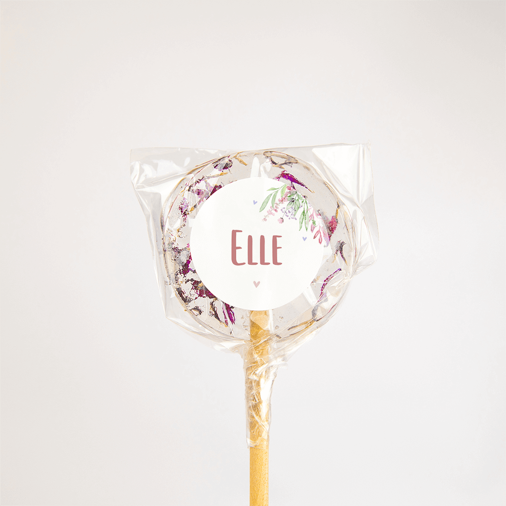 Deze sticker past bij het geboorte labelkaartje van jullie dochter. Langs de rand staat een mooie toef veldbloemen in groen, paars en roze. De naam staat in oudroze letters centraal en de kleine hartjes maken het helemaal af!