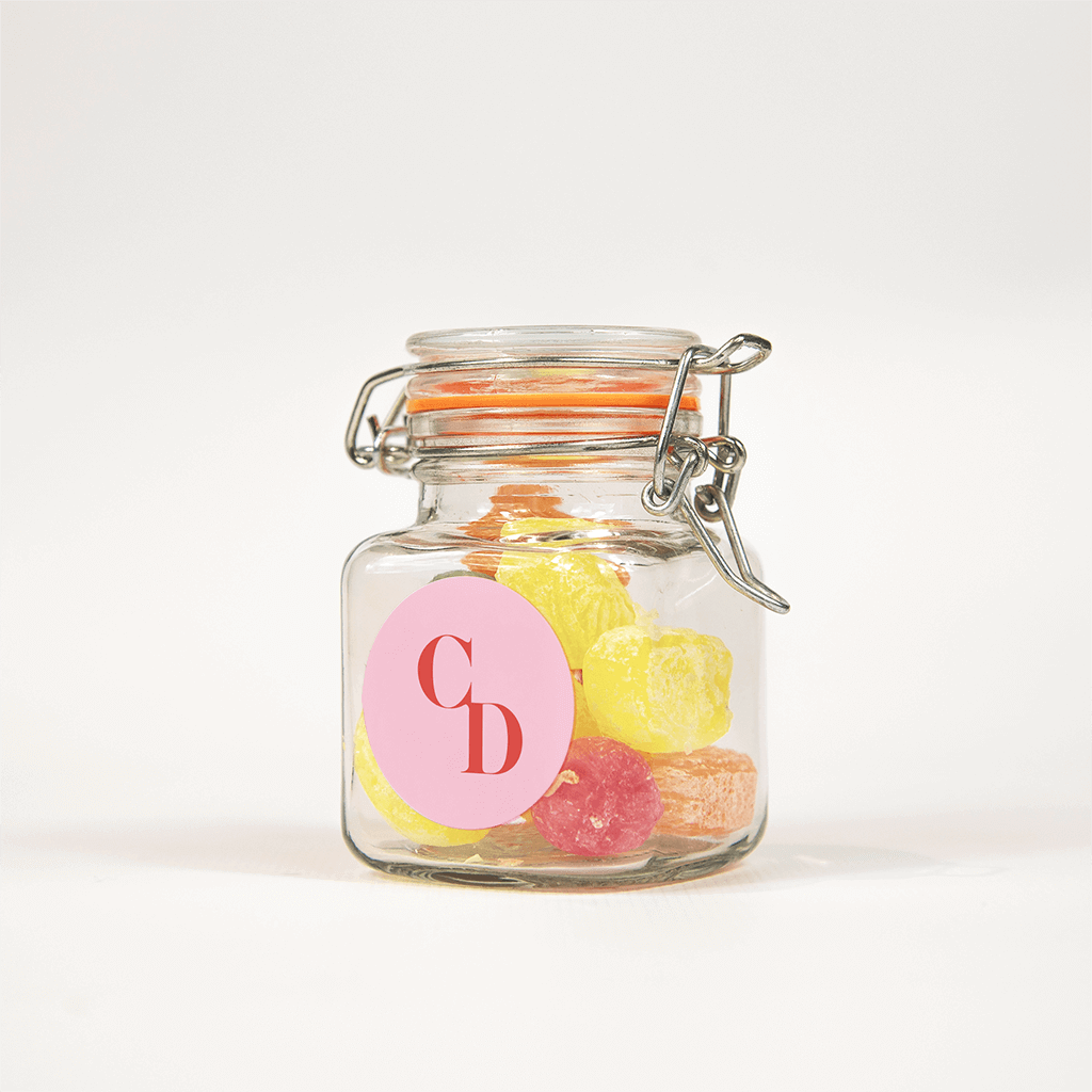 Stoere sticker voor doopsuikers in colorblock thema. De kleuren roze en rood staan fel tegenover elkaar en geven een opvallend effect