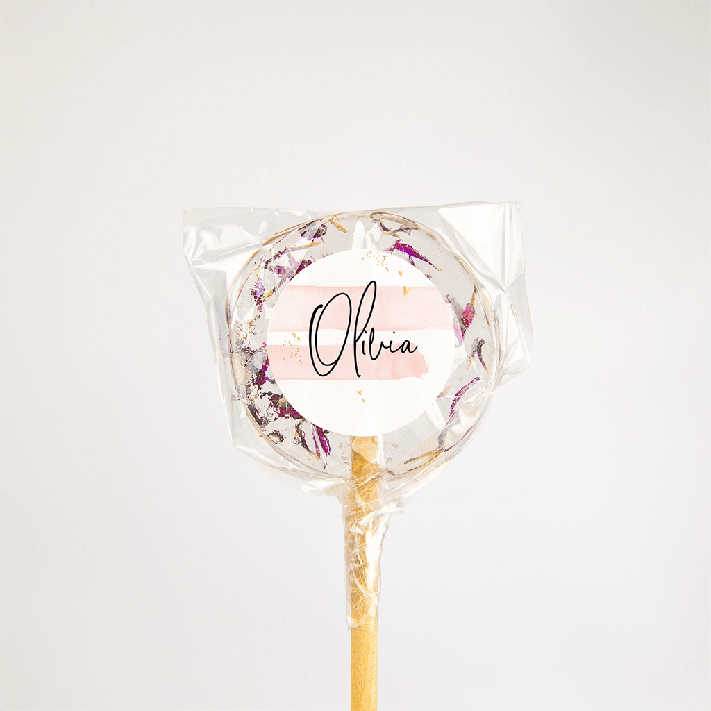 Bijpassende naamsticker bij het geboortekaartje van jullie dochter. Op de roze aquarelstrepen staat de naam van de kleine in sierlijk geschreven lettertype, de confetti en hartjes maken het extra feestelijk!