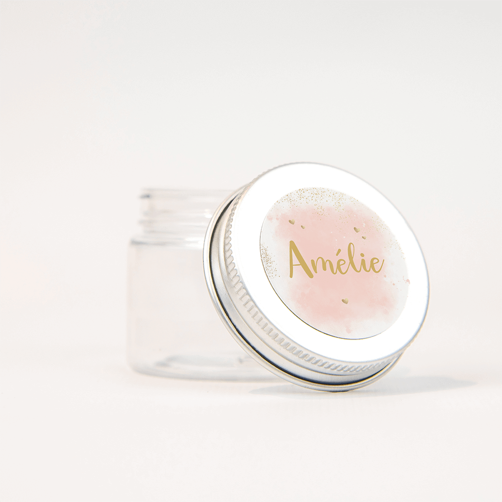 Lieve naamsticker bij het geboortekaartje van jullie dochter. Op de roze waterverf achtergrond staat de naam in trendy letters in goudkleur. De kleine hartjes en de goudkleurige confetti maken het helemaal feestelijk!| Totaalprijs: 0 |