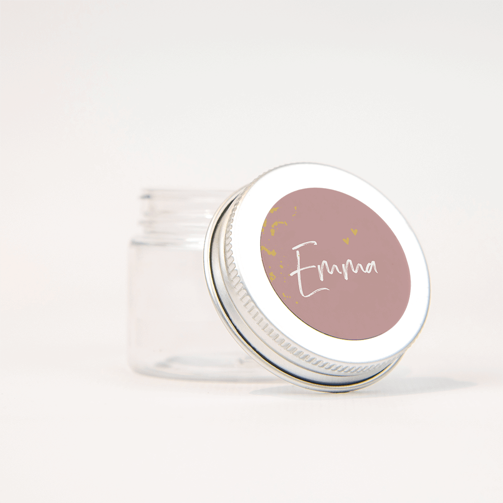 Een mooie naamsticker bij het geboortekaartje van jullie dochter! Zo sluit je gemakkelijk de envelopjes en geef je meteen een persoonlijk accent. Op de oudroze achtergrond staat de naam in witte trendy letters, de goudspetters en kleine hartjes maken het een mooi geheel.