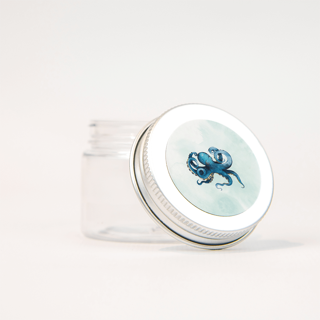 Vrolijke sticker bij het geboortekaartje met de octopus. De blauwe octopus zwemt in een zee van aquablauw.