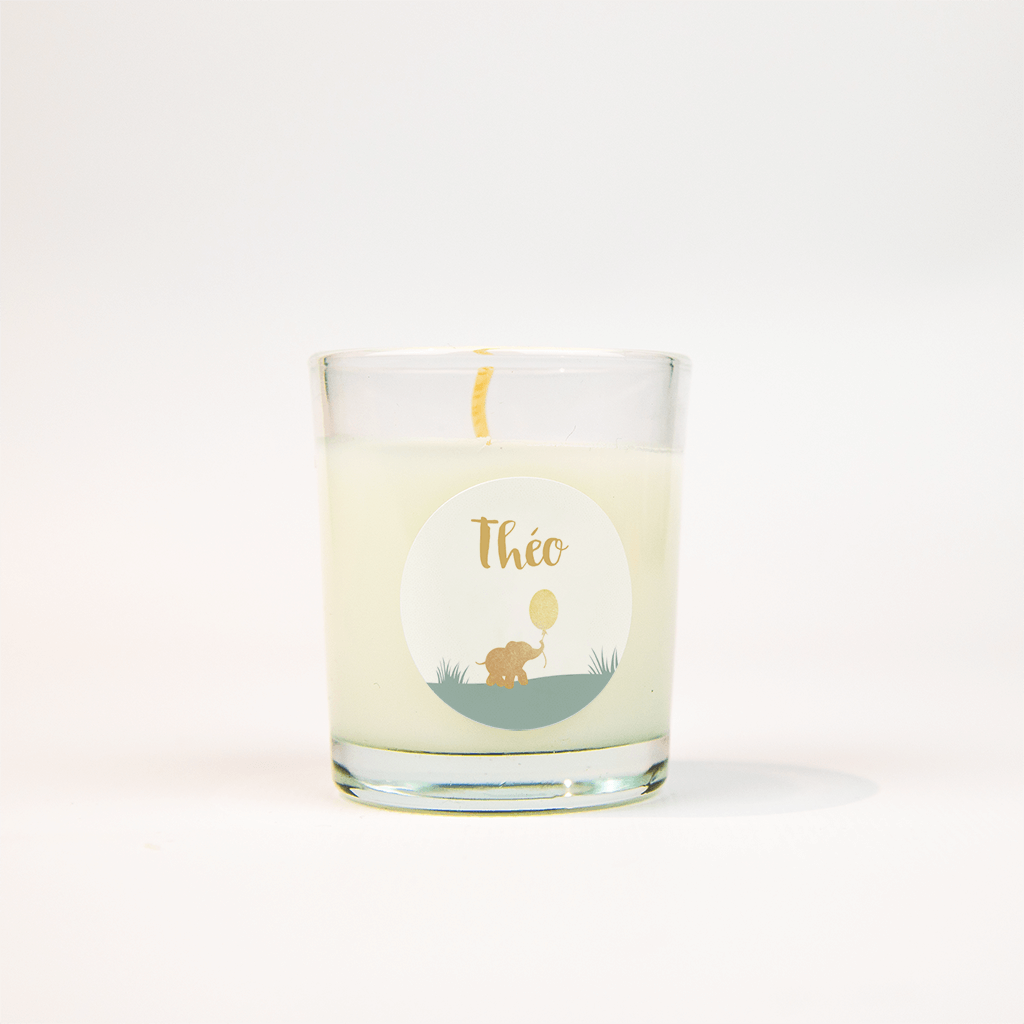 Deze sticker past perfect bij het geboortekaartje in junglestijl! Een goudkleurig olifantje wandelt met een ballon in zijn slurf door het grijsgroene landschap. Erboven staat de naam in losjes geschreven goudkleurige letters.