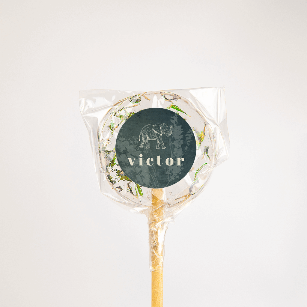 Een donkergrijze sticker met lichtgrijze vlekken. De naam van jullie zoontje staat in stoere witte letters en valt mooi op. Erboven wandelt een olifant in silhouettekening.