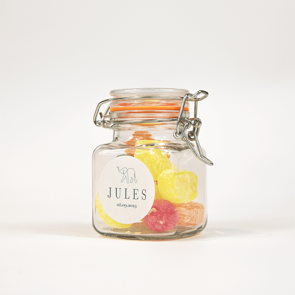 Leuke sticker die past bij het geboortekaartje met de olifantenfamilie. Op een ivoorwitte achtergrond staat een simpele silhouettekening van een olifantje. De naam van de kleine staat in strakke moderne letter eronder.