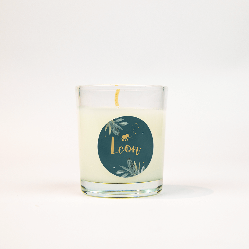 Blauwgroene sticker met olifant, takjes en sterretjes.