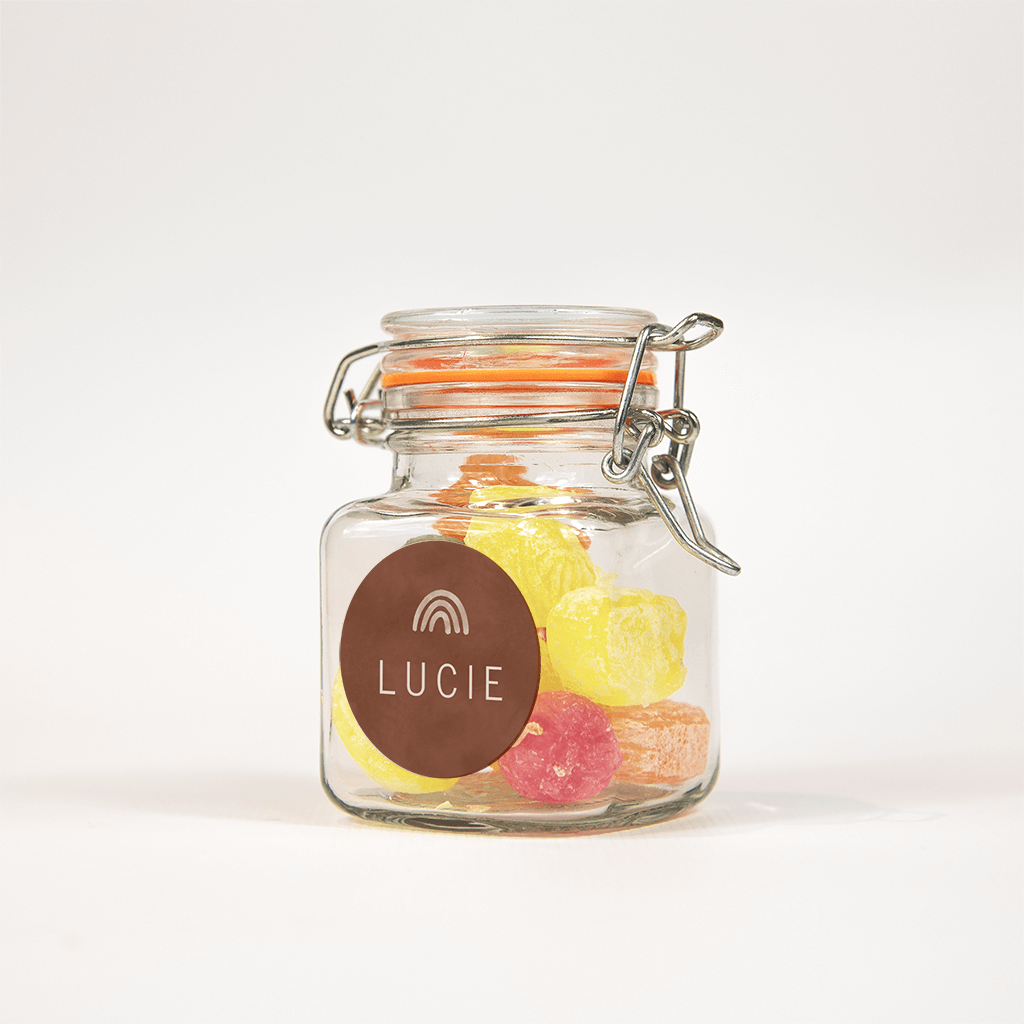 Trendy sticker met een bruine velvetlook achtergrond. De naam staat in een modern wit lettertype, erboven net als op het geboortekaartje een klein regenboogje, helemaal hip!| Totaalprijs: 0 |