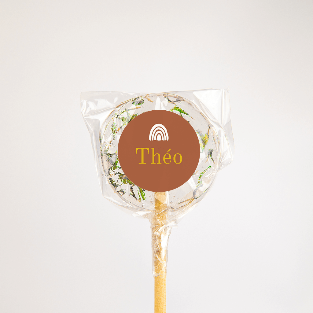 Bijpassende sticker bij het geboortekaartje met regenboogpatroon. Op de roodbruine achtergrond staat de naam van jullie zoontje in goudkleurig lettertype, erboven een klein wit regenboogje.