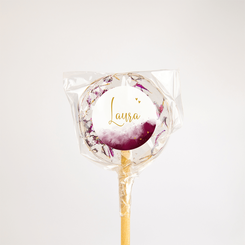Trendy sticker bij het geboortekaartje met de bordeauxrode waterverf. Boven de rand met watercolour staat de naam in goudkleur in sierlijk handschrift, erboven twee kleine hartjes.| Totaalprijs: 0 |