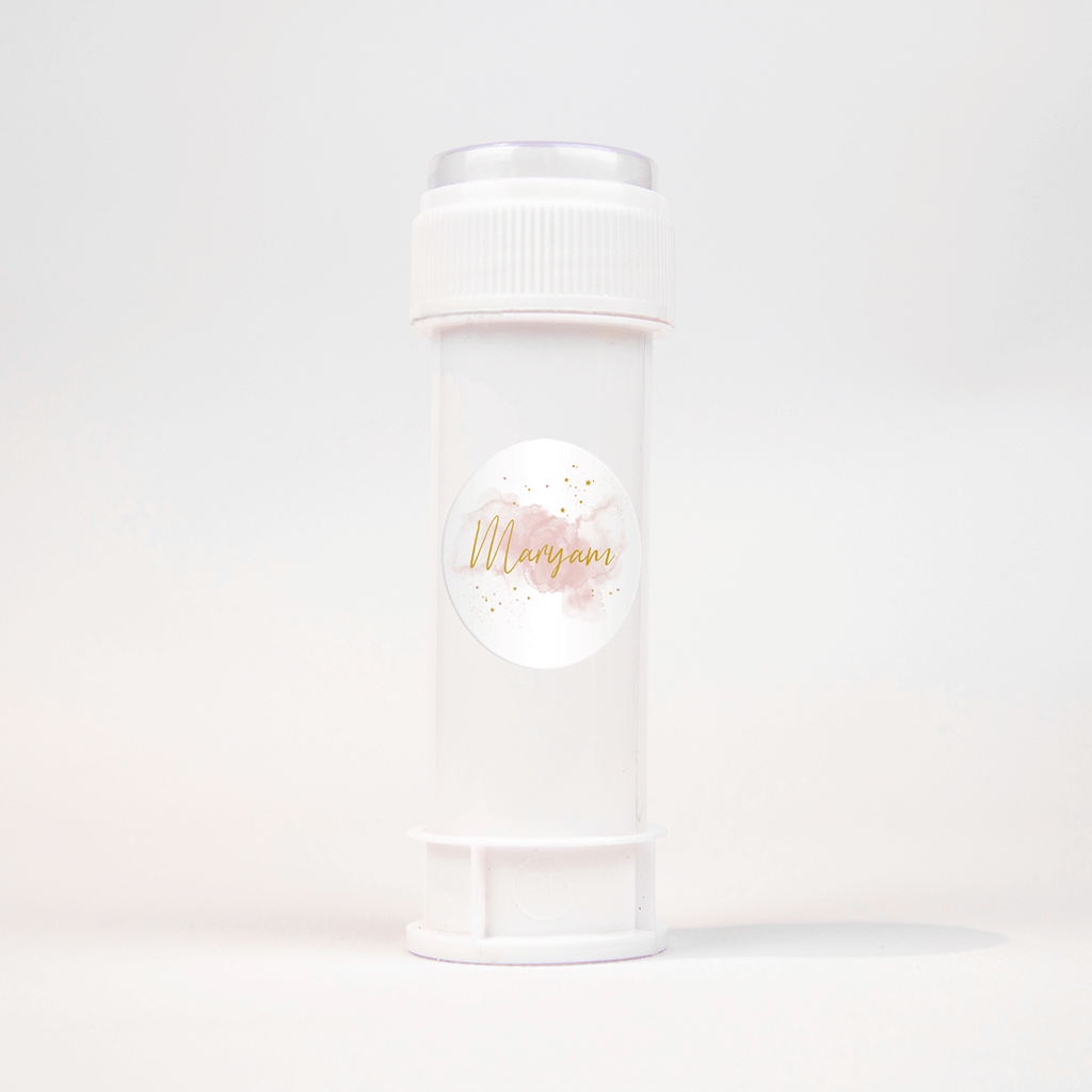 \ Bijpassende sticker bij het geboortekaartje met de maan in goudfolie. Op een roze waterverfvlak staat de naam in goudkleur in trendy handschrift, de goudkleurige sterretjes en spetters maken er een mooi geheel van.