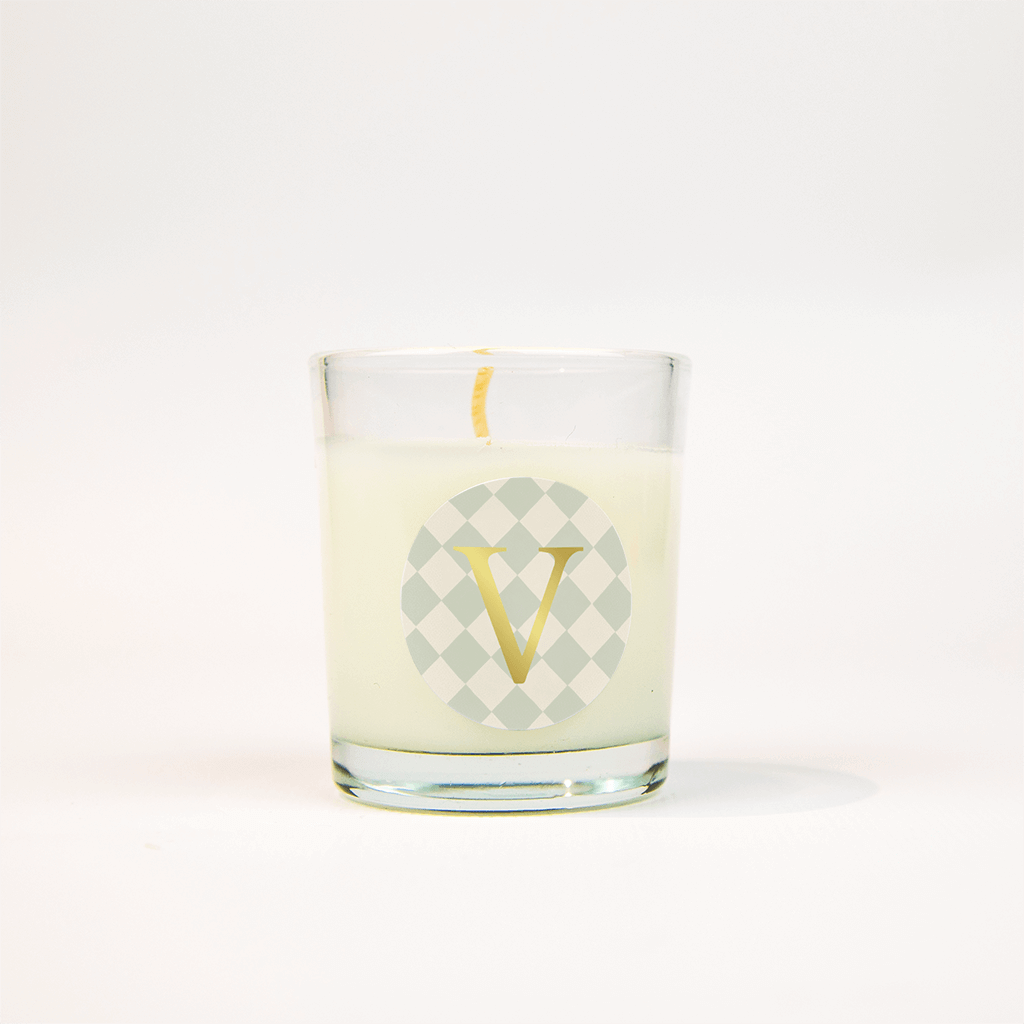 Een originele sticker met een ruitjes patroon in de kleur mintgroen. Op de sticker kan het initiaal van je kindje in goudfolie gedrukt staan.