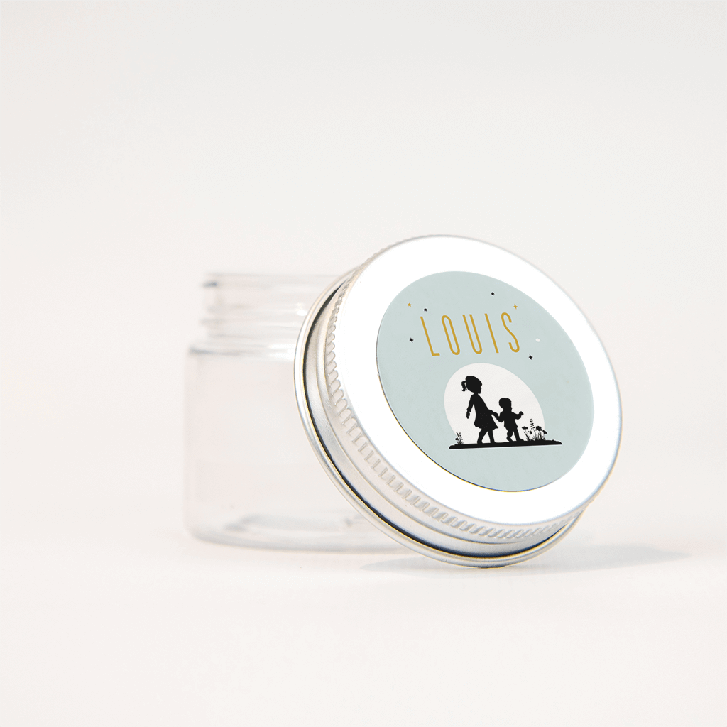 Deze sticker is in dezelfde stijl als het lichtblauwe geboortekaartje van het baby broertje. Op de lichtblauwe achtergrond staat in een witte cirkel de silhouettekening van een zusje met een klein broertje in een landschap. Om de naam in goudkleur staan kleine sterretjes.| Totaalprijs: 0 |