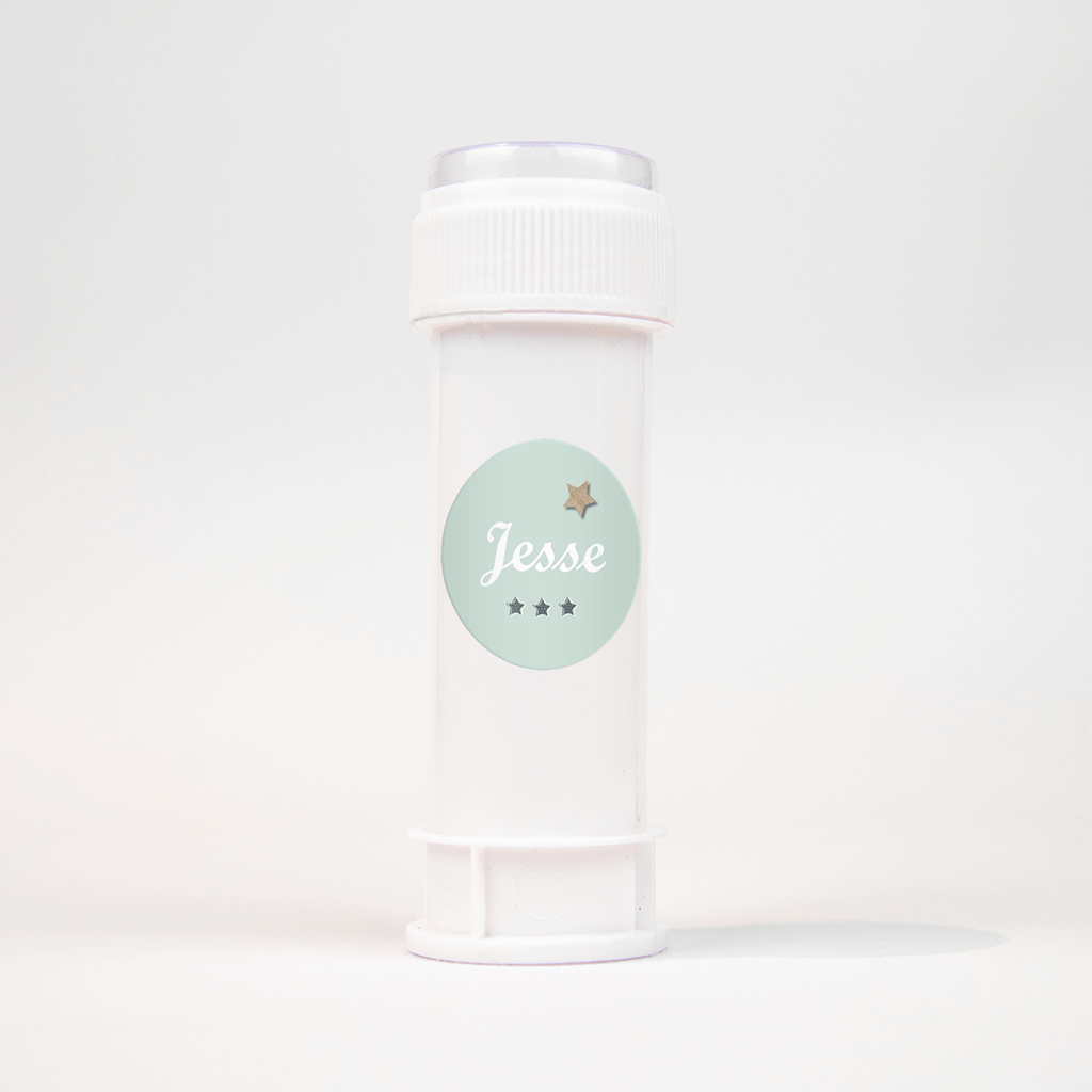Een mintgroene sticker met de naam in het midden in witte trendy letters. Erboven een ster in houtlook en onder de naam drie sterren in donkerblauw met witte stipjes, stoer en lief tegelijk!