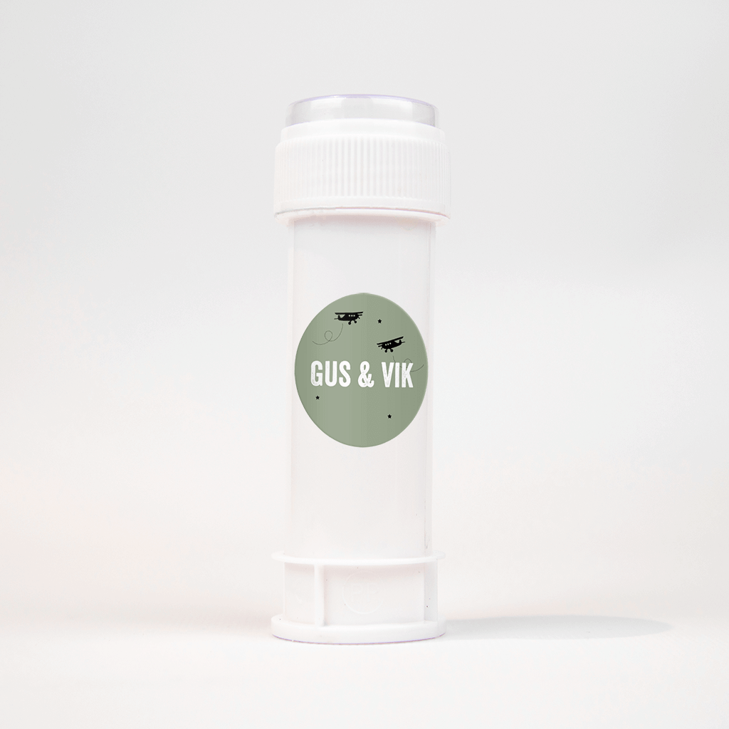 Bijpassende sticker bij het groene geboortekaartje voor een tweeling. Op de olijfgroene sticker staan de namen van jullie zoontjes in grote witte letters in het midden. Erboven in silhouet twee vliegtuigjes tussen de sterren, een stoere sticker om de envelopjes mee te sluiten!