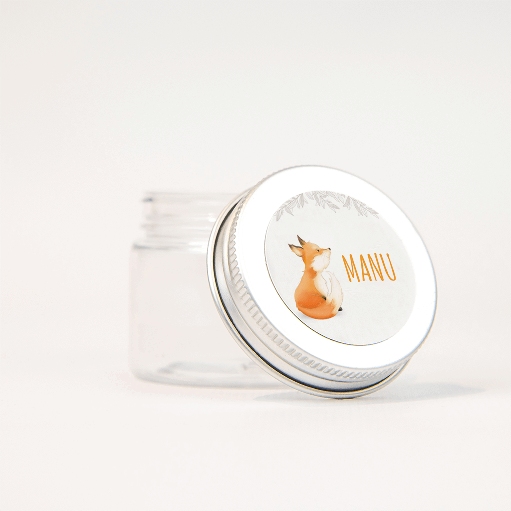 Deze sticker past perfect bij het geboortekaartje met het grappige vosje. Naast het vosje staat de naam van de kleine in dezelfde roodbruine kleur in trendy letters, erboven een grijs bladerdak. Deze sticker staat supermooi op de roestbruine enveloppe!