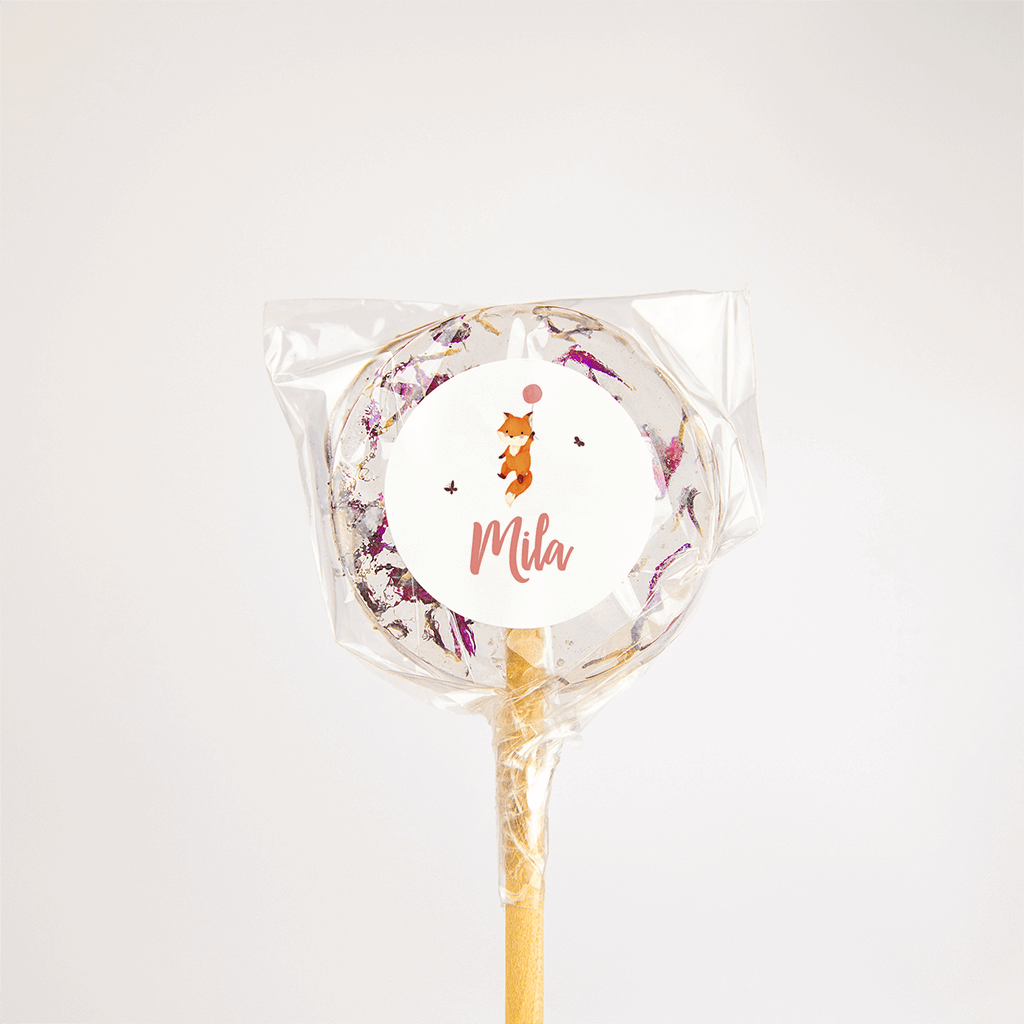 Op de witte achtergrond zweeft een lief vosje met een roze ballon, eronder de naam in dezelfde kleur roze in trendy letters. Er omheen fladderen vrolijke vlindertjes.