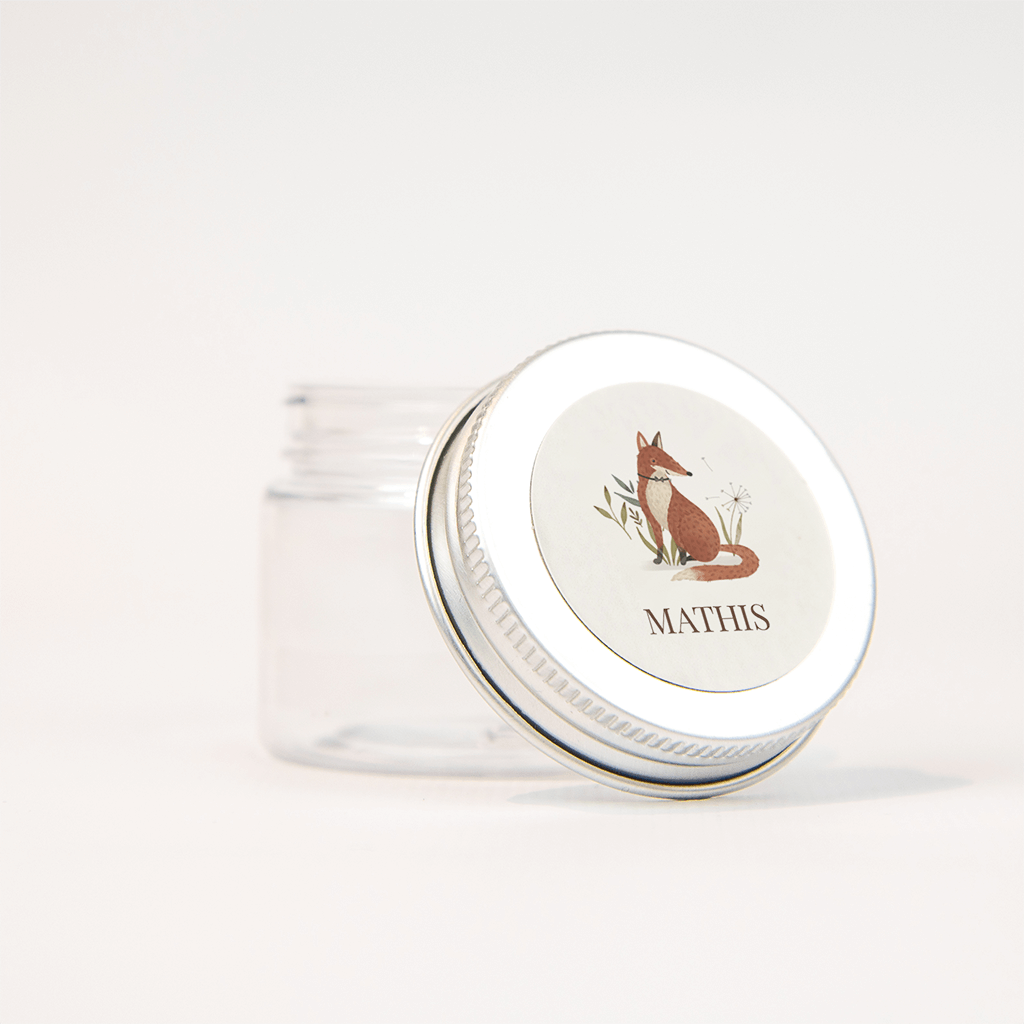 Superschattig, deze sticker bij het geboortekaartje! Boven de naam in modern lettertype zit een lief vosje op de uitkijk tussen de bloemetjes.