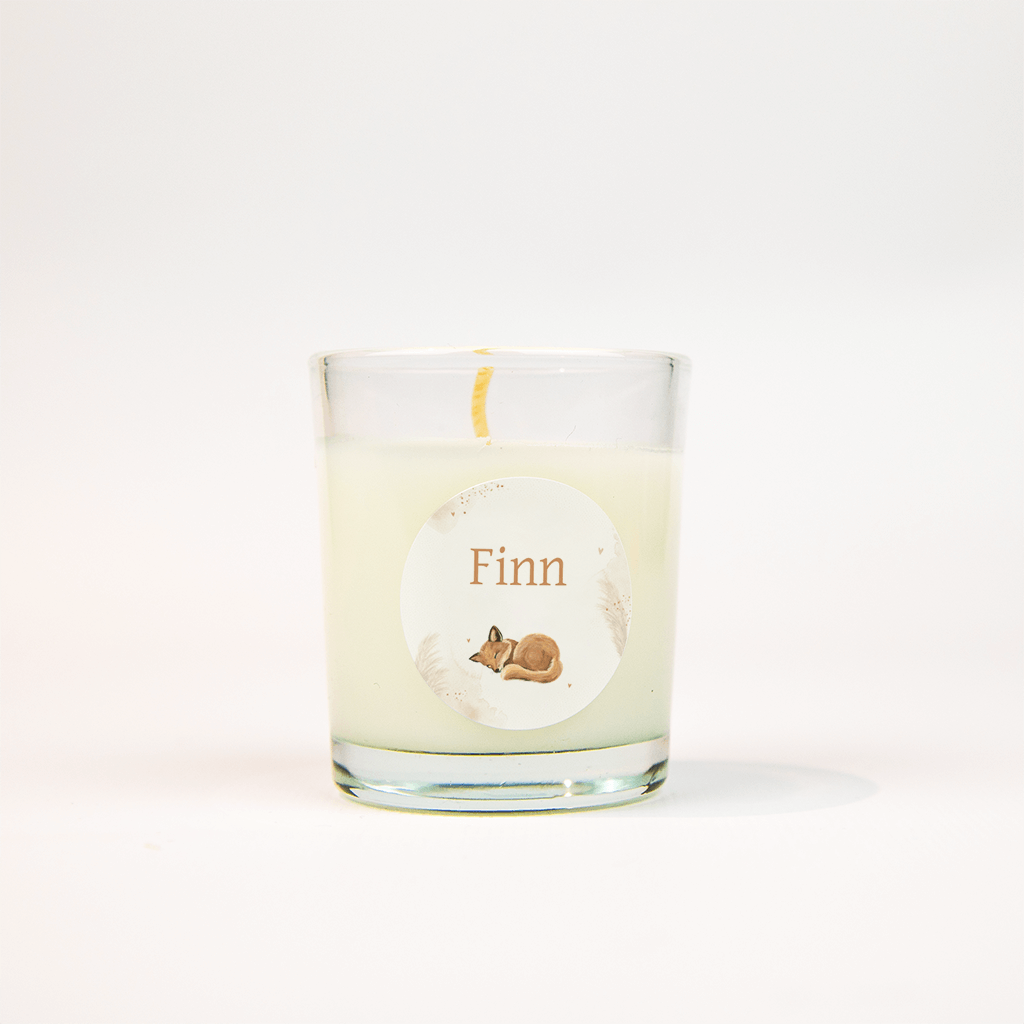 Op een witte achtergrond met bruine waterverf- vlakken ligt een klein vosje te slapen, erboven in trendy letters de naam van de kleine, echt lief!| Totaalprijs: 0 |