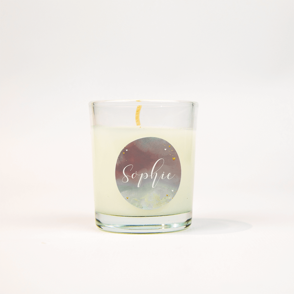 Kleurrijke sticker met een watercolour achtergrond in verschillende tinten. De naam staat in sierlijke witte letters in het midden. De kleine hartjes in wit en goud zorgen voor een lief accent.
