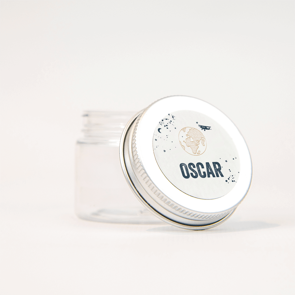 Bijpassende sticker bij het houten geboortekaartje van jullie zoontje. Op de witte sticker staat een getekende bruine wereldbol. Erboven een vliegtuigje tussen de maan en sterretjes en spetters in donkerblauw, de naam staat in dezelfde kleur in grote letters, stoer!