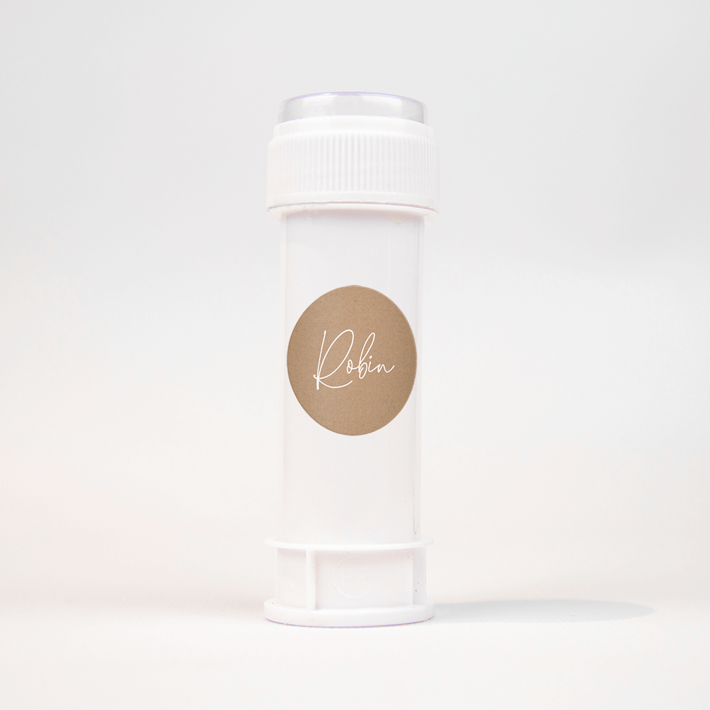 Sticker met witte naam op kraft-look - per vel van 25 stickers