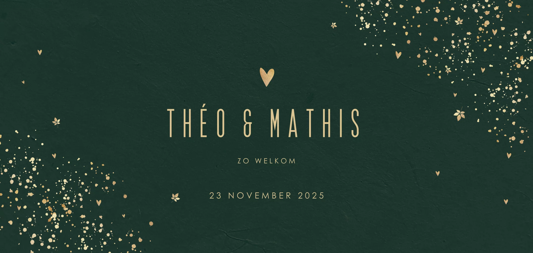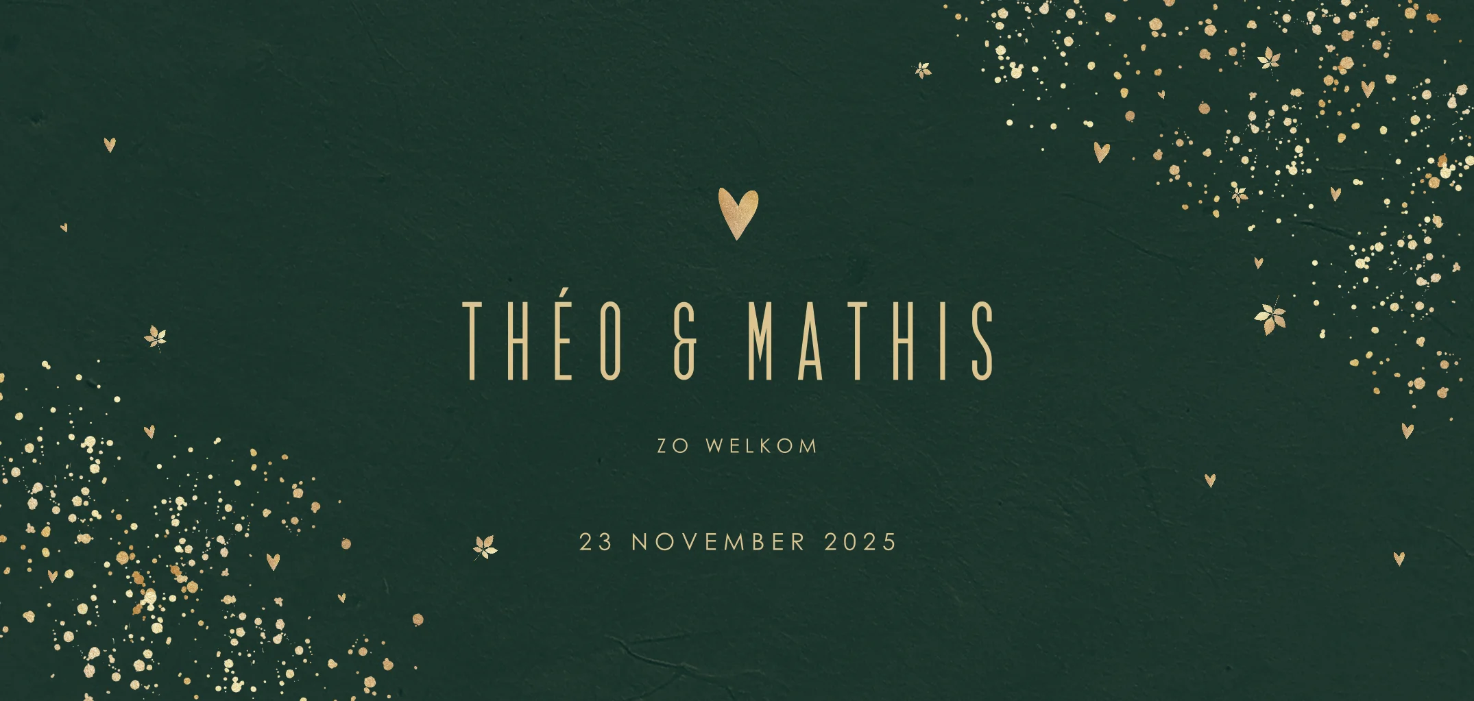 Verwachten jullie een jongenstweeling? Dan is dit stoere, donkergroene geboortekaartje een perfecte match! De namen staan in moderne typografie in goudgeel, een wolk van spetters en blaadjes staan in de hoek en de lieve hartjes maken het compleet.