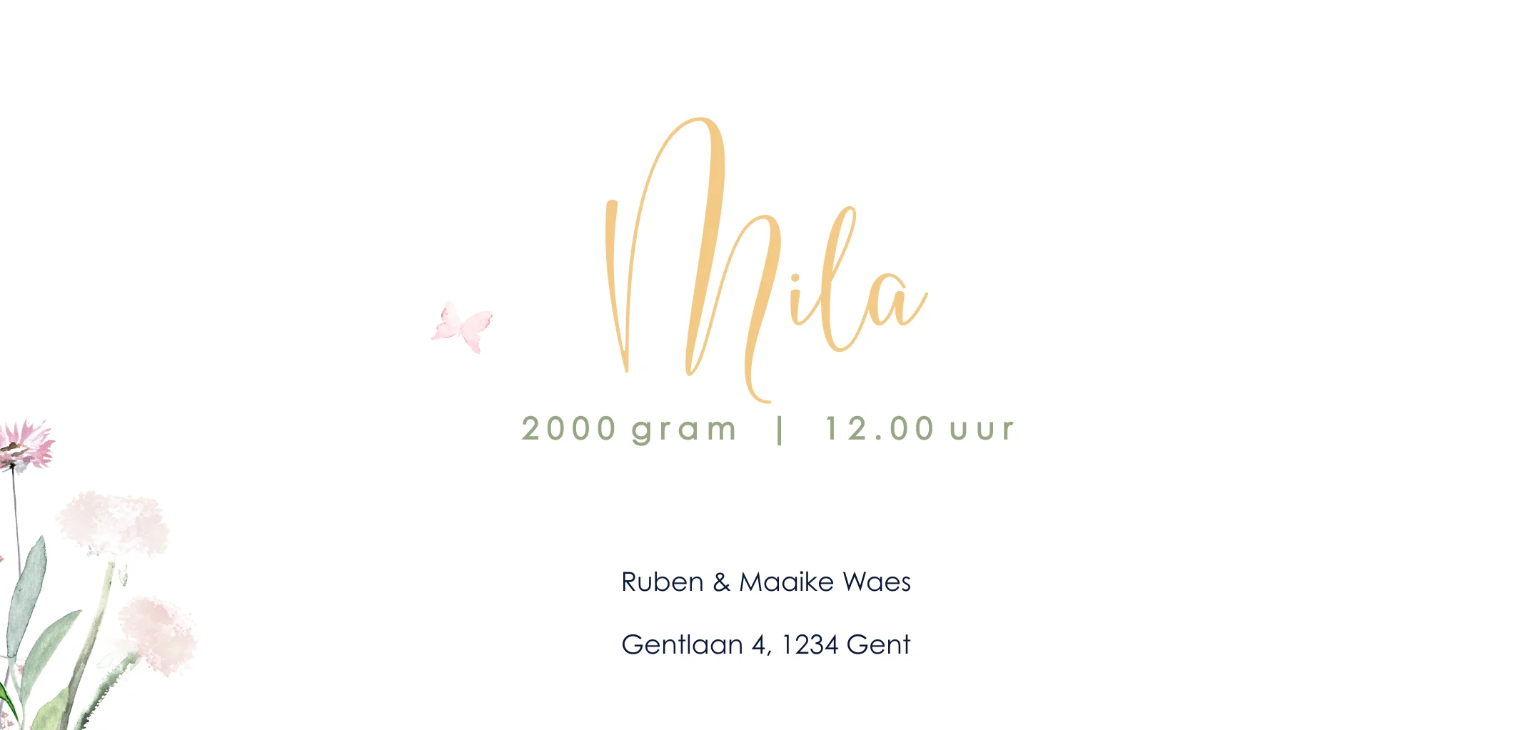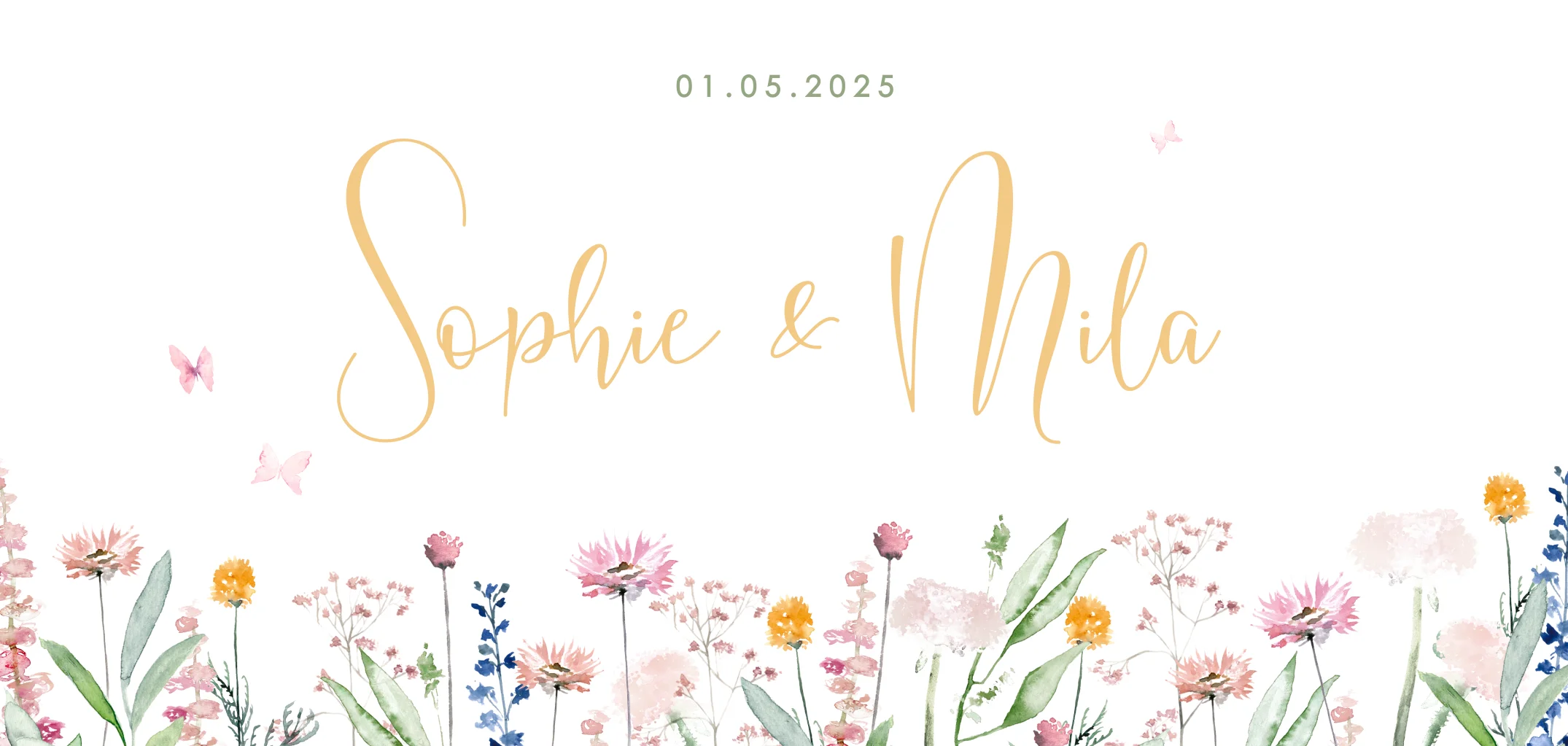 Verwachten jullie een meisjestweeling? Dit romantische geboortekaartje past perfect bij de geboorte van twee meisjes! Onderaan het kaartje staat een rand van veldbloemen in vrolijke kleuren met vlinders erboven. De namen staan in sierlijke letters, pas het kaartje naar wens aan in de online editor.