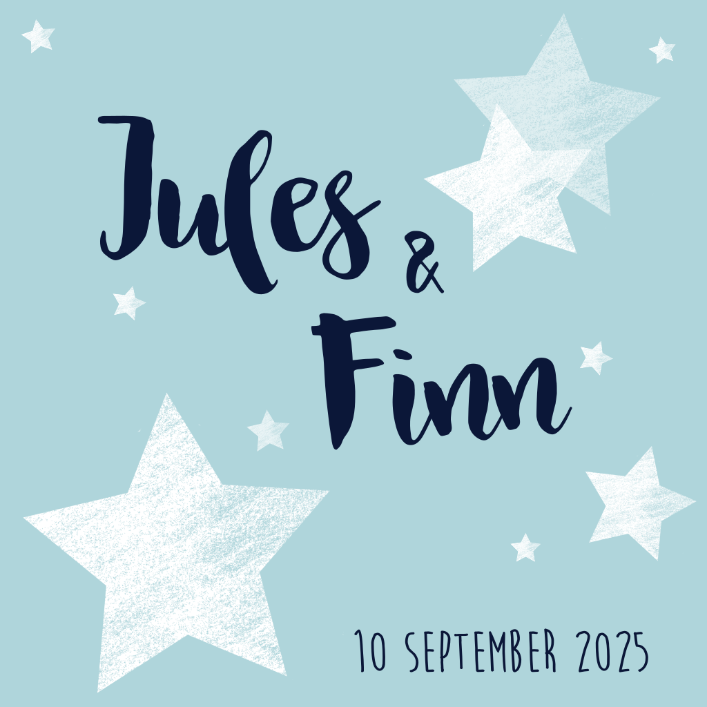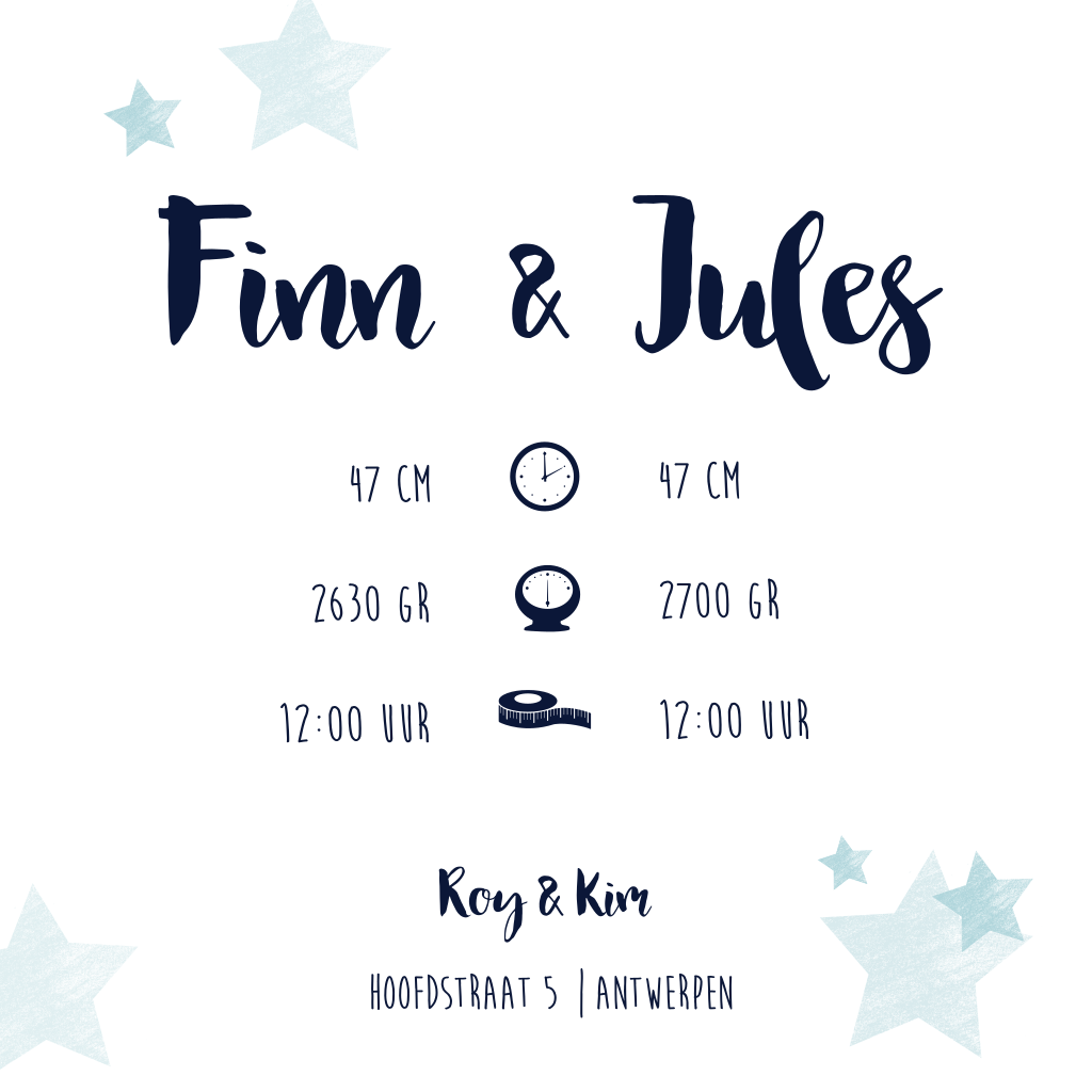Hoera, een tweeling! Deze stoere geboortekaart in blauw met sterren is leuk om de geboorte van jullie zoons mee aan te kondigen! Aan de binnenzijde staan leuke icoontjes naast de tekst. Maak hem compleet met eigen teksten in de lettertypes die jij mooi vindt.