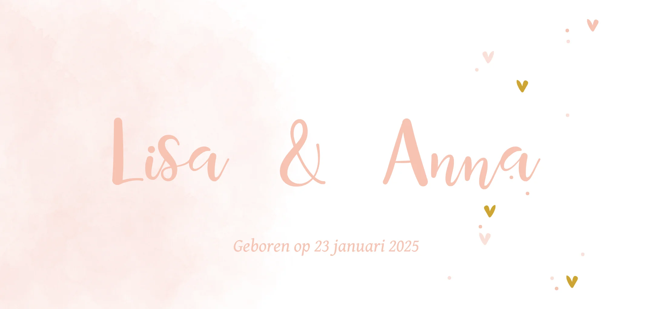 Een hip tweeling geboortekaartje voor meisjes. Dit panorama geboortekaartje heeft kleine hartjes in het design en watercolour. In onze online editor kun je kiezen uit verschillende lettertypes en kleuren.