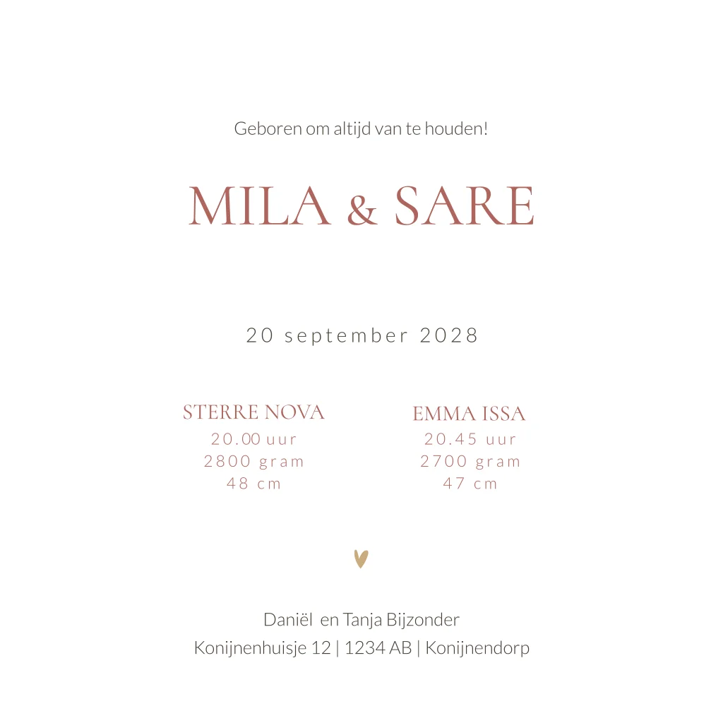 Op zoek naar een schattig geboortekaartje voor jullie tweeling? Deze dubbelgevouwen vierkante kaart is een teder en uniek ontwerp met twee konijntjes in zachte aquarelkleuren. Elk konijntje straalt een eigen karakter uit, maar samen vormen ze een liefdevol duo net zoals jullie kleintjes.
