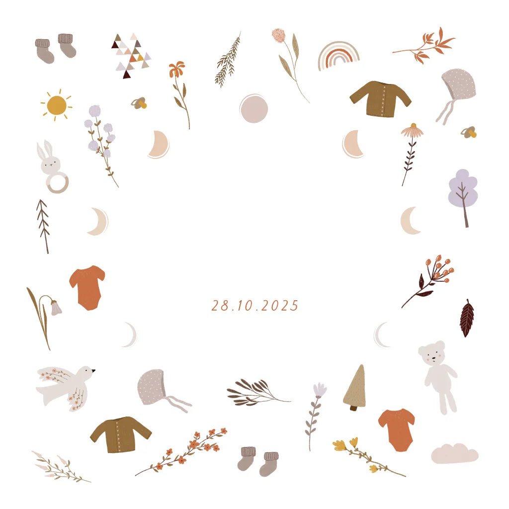 Tweeling geboortekaartje met kleine illustraties in fijne kleuren en goudfolie. Ook zijn de maanstanden te zien in een boog rond de namen.