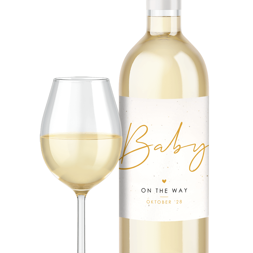Wijnsticker voor op een wijnfles om je zwangerschap aan te kondigen aan familie of vrienden. De sticker heeft sierlijke letters en een lichte achtergrond.