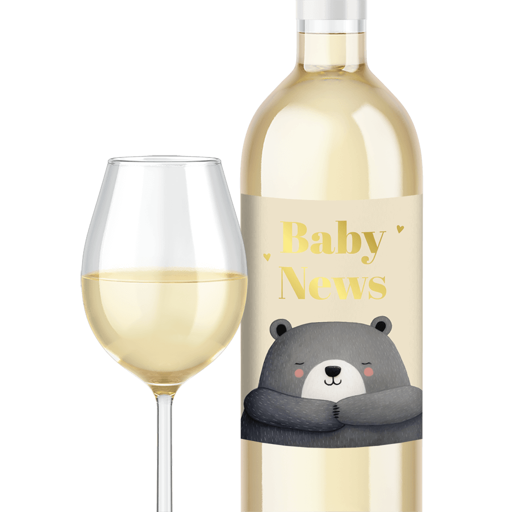 Wijnsticker voor op een wijnfles om je zwangerschap aan te kondigen aan familie of vrienden. De sticker heeft goudfolie tekst en de afbeelding van een lieve beer.