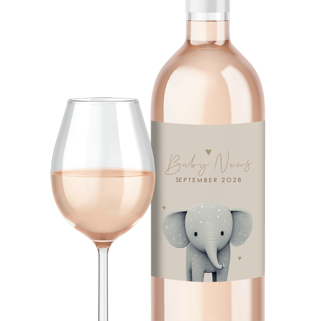 Wijnsticker voor op een wijnfles om je zwangerschap aan te kondigen aan familie of vrienden. De sticker heeft een schattig olifantje en sierlijke tekst met 'Baby News'.