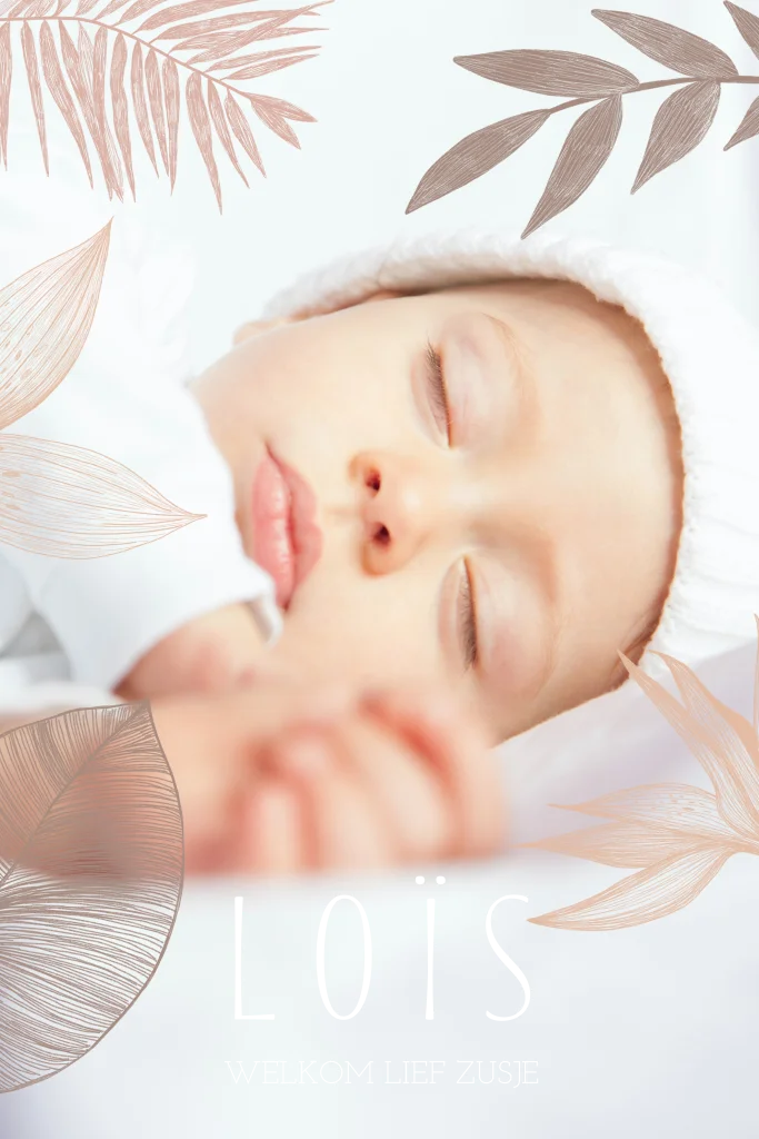 Lief geboortekaartje met ruimte voor eigen foto en trendy bladeren in zachte roze pasteltinten. De naam wordt in roségoudfolie gedrukt. Je kunt de kleuren en bladeren helemaal zelf aanpassen in de online editor.