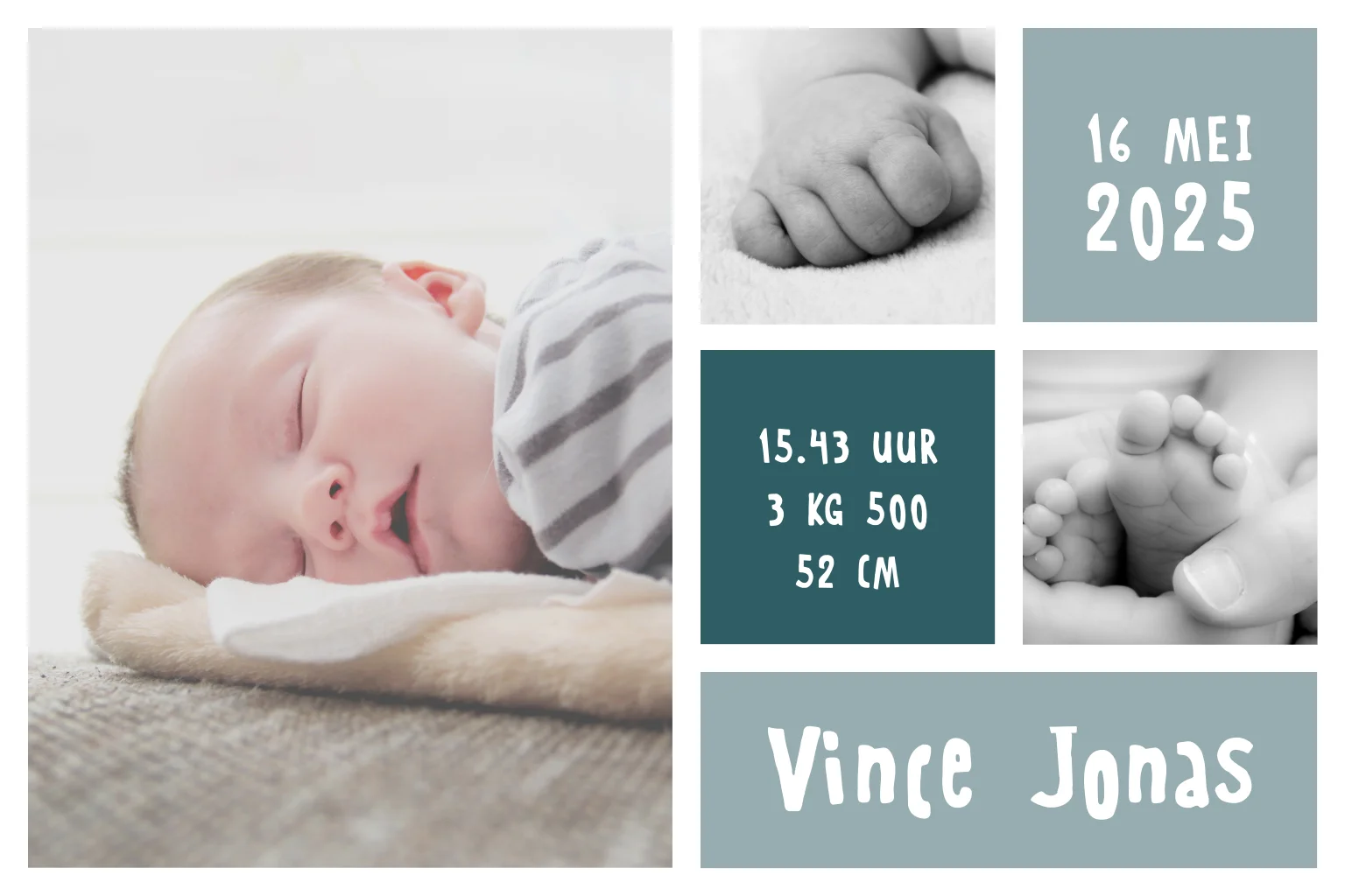 Ontwerp je eigen stoere foto geboortekaartje voor je kindje en voeg foto's van je zoon of dochter toe in de fotoblokken. Met een tekst in verschillende hippe lettertypes in de gekleurde vlakken maak je het kaartje helemaal af!
