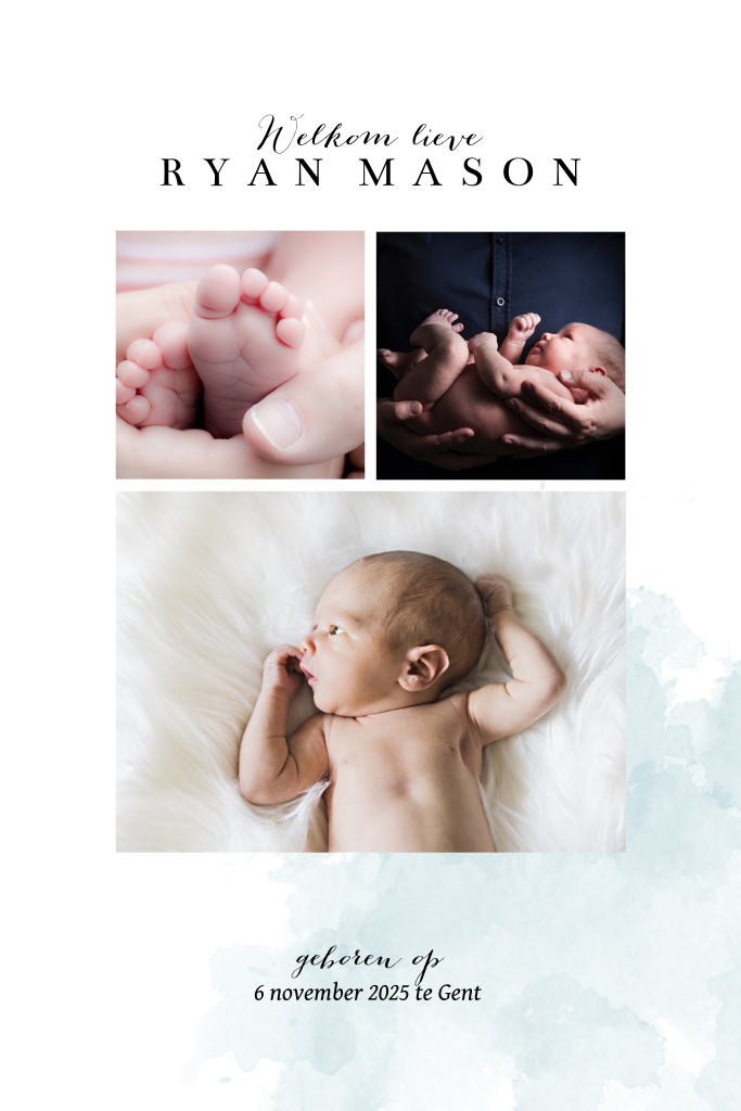 Ontwerp een hippe foto geboortekaart met watercolour voor je zoon of dochter en voeg mooie foto's toe in de foto blokken. Met een trendy lettertype maak je de kaart helemaal af!